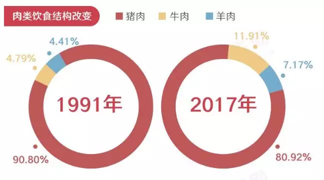然而,近年來,中國消費(fèi)者對豬肉的熱情似乎在減退。根據(jù)新華網(wǎng)最新發(fā)布的數(shù)據(jù)顯示,在由豬、牛、羊三類構(gòu)成的肉類市場中,豬肉的消費(fèi)量占比已經(jīng)從1991年的90.8%下降到2017年的80.9%。而且,這一數(shù)據(jù)還將繼續(xù)下降。此消彼長之下,牛肉的消費(fèi)量有了不少的提升。