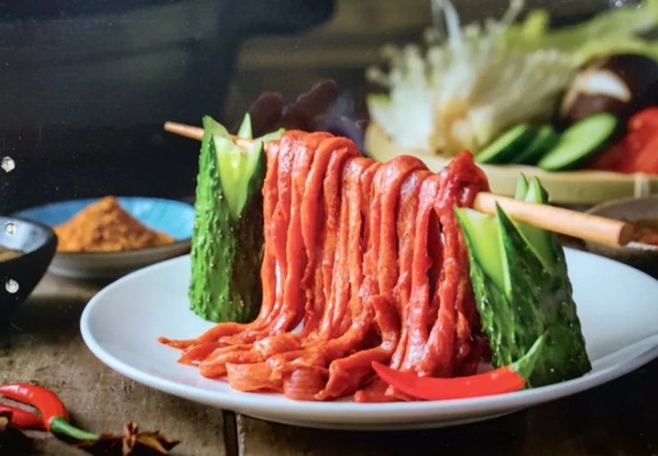 除了火鍋牛排外,鮮之味還推出了牛舌面,這款產(chǎn)品摒棄了常規(guī)片狀形態(tài),將高端牛肉以面條狀呈現(xiàn)給食客,在各大展會上非常吸引眼球,是該公司主力產(chǎn)品之一。