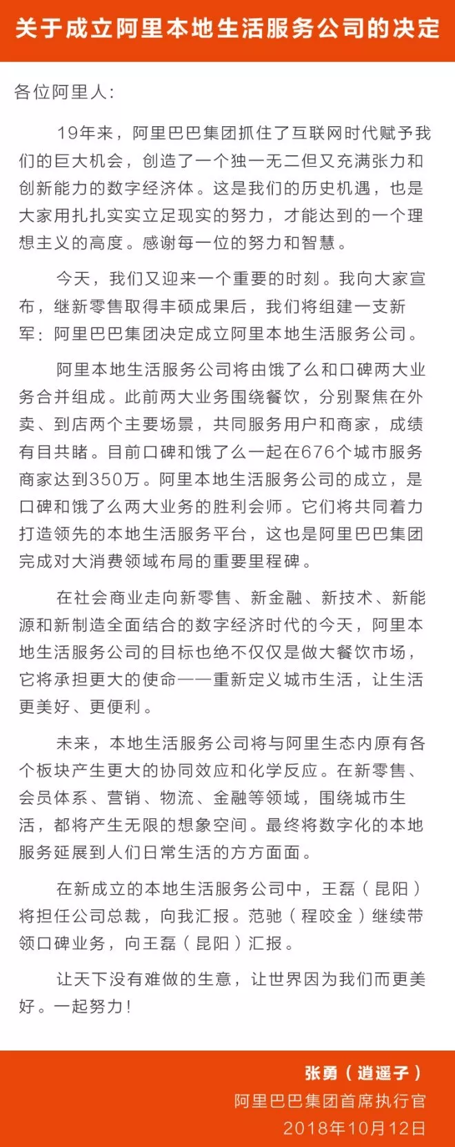 據(jù)悉,阿里巴巴集團(tuán)合伙人王磊(花名昆陽)將擔(dān)任阿里本地生活服務(wù)公司總裁,向阿里集團(tuán)CEO張勇匯報(bào),并兼任餓了么CEO;阿里巴巴集團(tuán)副總裁范馳(花名程咬金)將繼續(xù)帶領(lǐng)口碑業(yè)務(wù),向王磊匯報(bào)。