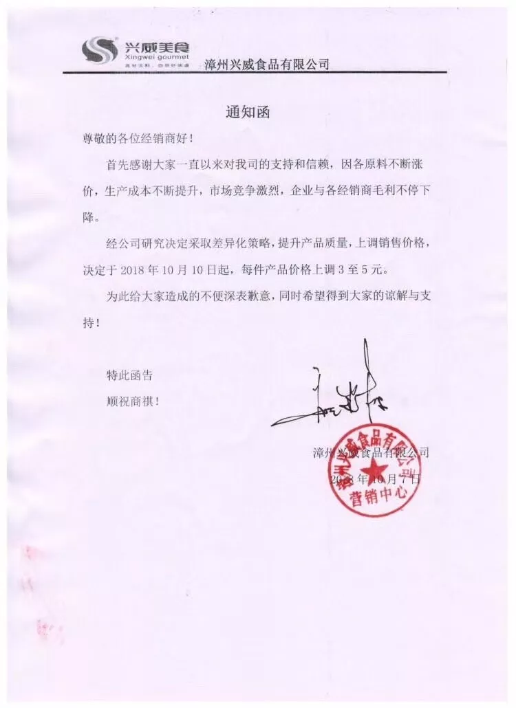 就在國慶假期的最后一天,10月7日,漳州興威食品有限公司(簡稱“興威食品”)也發(fā)出了類似的通知函:決定于10月10日起,每件產(chǎn)品價(jià)格上調(diào)3至5元。