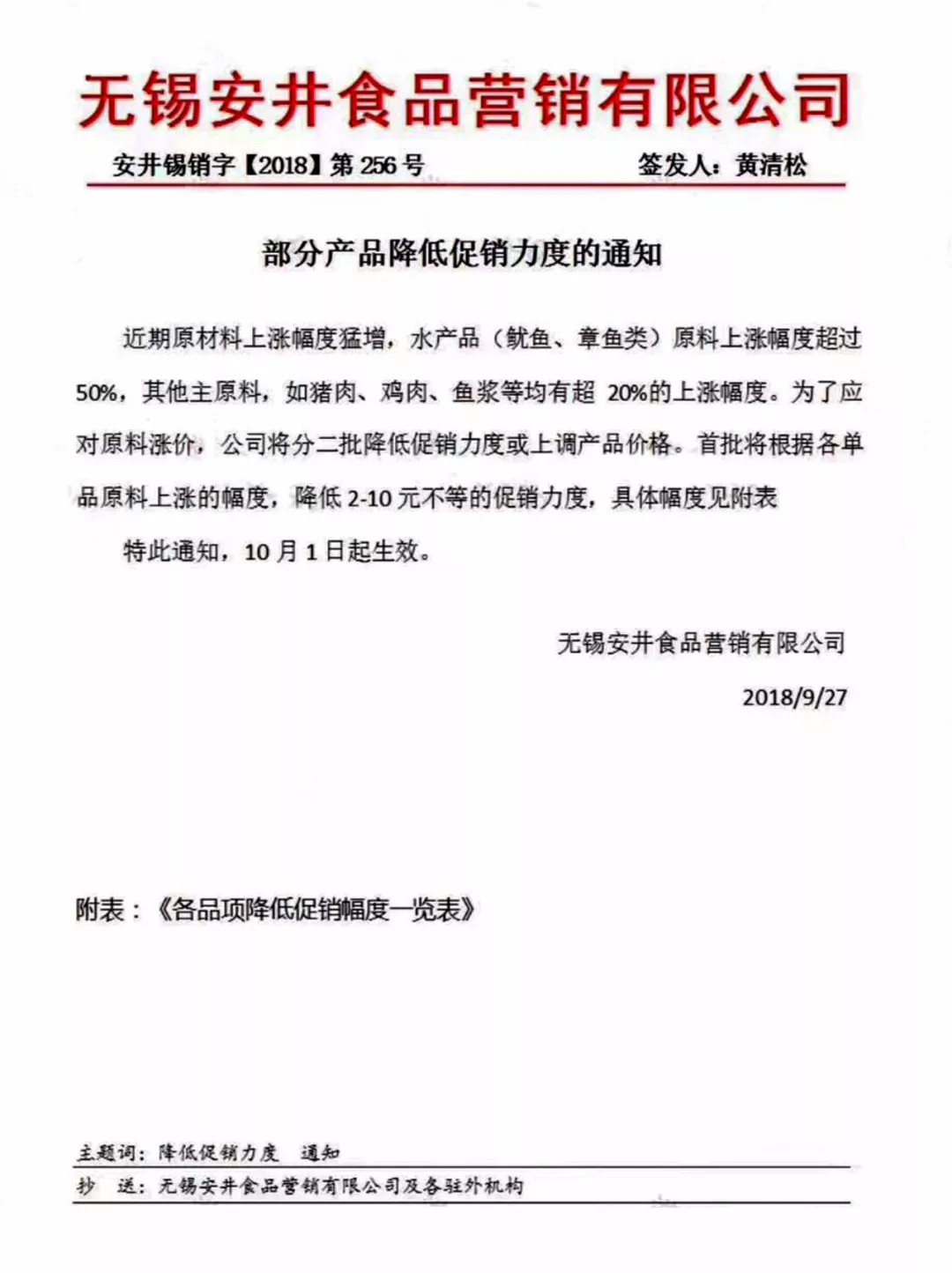 9月27日,無錫安井食品營銷有限公司(簡稱“安井食品”)發(fā)出的“部分產(chǎn)品降低促銷力度的通知”,在朋友圈廣為傳播。