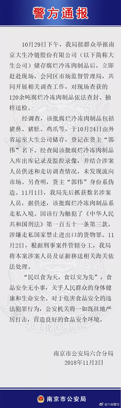 南京市公安局六合分局官方微博@六合警方發(fā)布關于南京大生冷鏈股份有限公司儲存腐爛冷凍肉制品調(diào)查情況的通報如下: