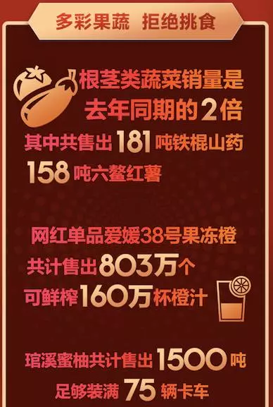 在果蔬單品銷售榜中,VC滿滿的網(wǎng)紅單品愛媛38果凍橙占據(jù)了C位,共計賣出803萬個,可鮮榨160萬杯500ml的橙汁;同樣富含VC的知名“網(wǎng)紅”琯溪蜜柚共計售出1500噸,足夠裝滿75輛卡車;代表著健康的根莖類蔬菜同樣銷量不俗,181噸鐵棍山藥,158噸六鰲紅薯被搶購一空。