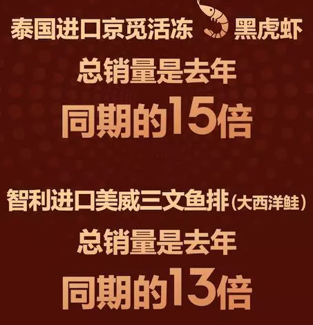 其中,泰國海產(chǎn)總銷量是去年同期6倍;智利共計售出56噸海鮮水產(chǎn),是去年同期的5倍;挪威海產(chǎn)銷量達(dá)30000件,其中僅三文魚便占到了總銷量的30%;加拿大大龍蝦共計賣出12噸,頭尾相連可繞天安門廣場三圈;自營法國生蠔銷量是去年同期的15倍……