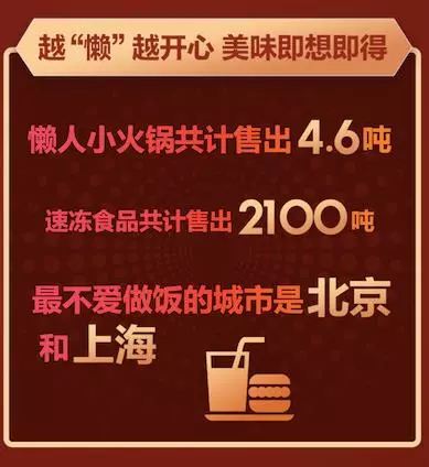 數(shù)據(jù)也證明了“懶人經(jīng)濟(jì)”的真實(shí)存在。11.11期間,京東生鮮懶人小火鍋(自熱火鍋)共計賣出4.6噸;速凍食品共計售出2100噸;方便菜銷量是去年同期的1.8倍;火鍋相關(guān)食材售出757噸,夠冰島全民一起吃五次火鍋,其中北京地區(qū)消費(fèi)者買得最多;簡單加工就能食用的面點(diǎn)銷量是去年同期的2倍;速凍水餃、餛飩的銷量也接近去年同期的2倍。