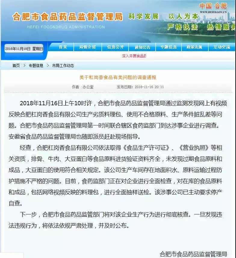 經(jīng)查,安徽合肥杠崗香食品有限公司依法取得相關(guān)資質(zhì),食品原料進(jìn)貨驗(yàn)證資料齊全,未發(fā)現(xiàn)過(guò)期食品原料和成品,大豆蛋白的使用符合相關(guān)規(guī)定。