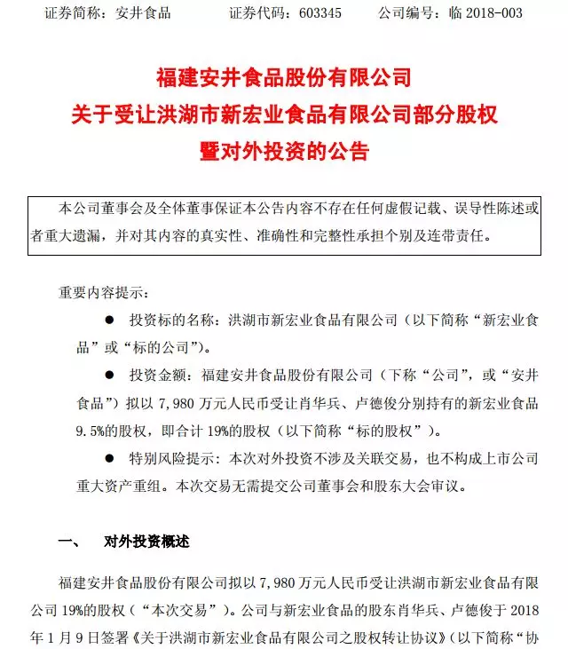 1月9日晚,安井食品發(fā)布公告,擬以7980萬元受讓新宏業(yè)食品19%的股權(quán)。公司與新宏業(yè)食品的股東肖華兵、盧德俊于2018年1月9日簽署《關(guān)于洪湖市新宏業(yè)食品有限公司之股權(quán)轉(zhuǎn)讓協(xié)議》。