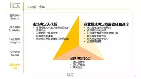 以太投資團隊曾經(jīng)從3個維度,對B2B平臺通常面臨的問題(也就是常見的“坑”)做了總結(jié),分別是市場/方向、團隊和商業(yè)模式。他們認為,B2B所在的市場決定了發(fā)展的天花板,團隊決定了起點,而商業(yè)模式?jīng)Q定了平臺發(fā)展的路徑和速度。這也是B2B平臺在尋求投資的過程中,最為投資人所看重的三個方面。