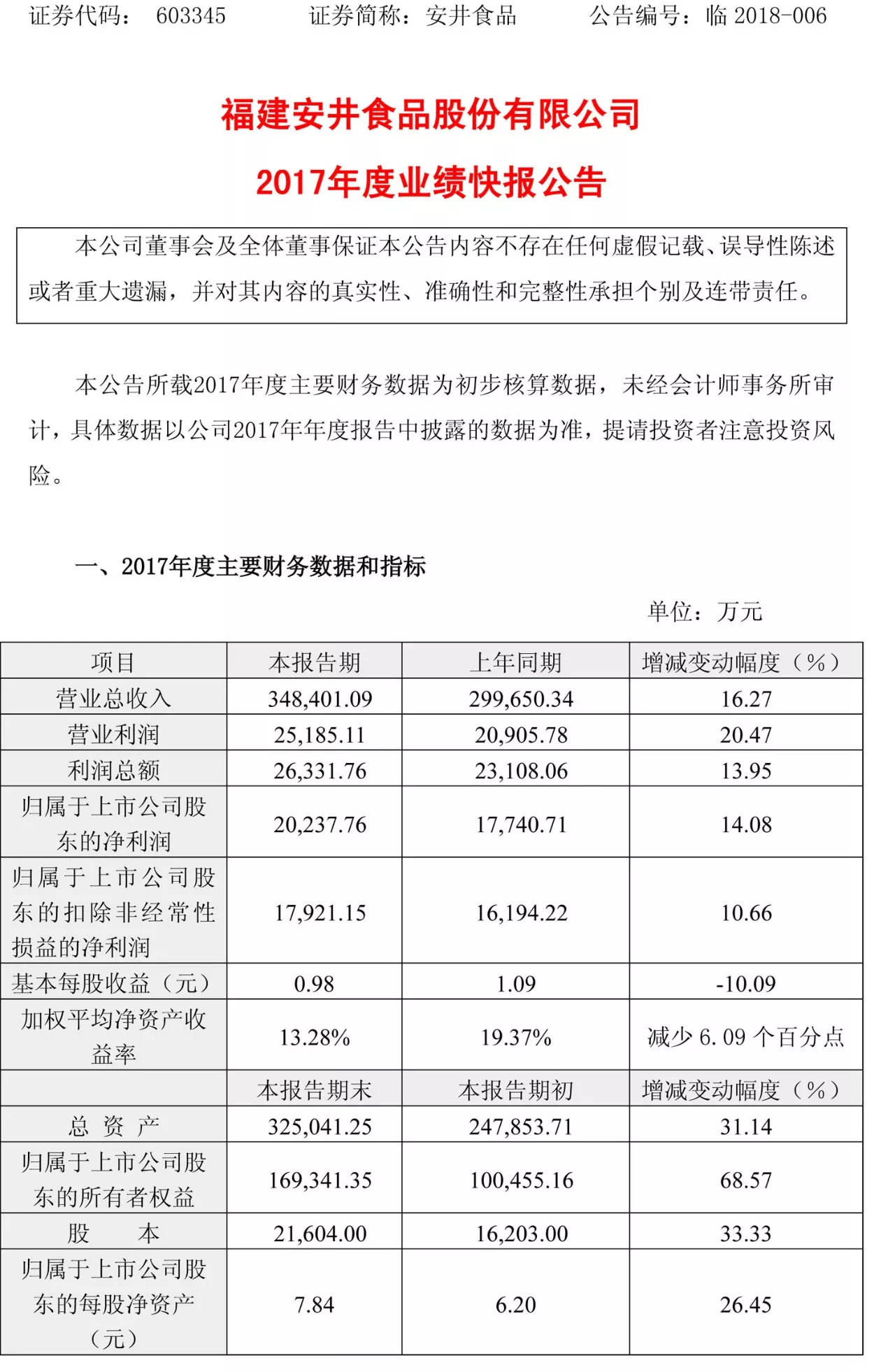 公告顯示2017年,安井食品實(shí)現(xiàn)營(yíng)業(yè)收入34.8億元,同比增長(zhǎng)16.27%,實(shí)現(xiàn)利潤(rùn)總額2.63億元,同比增長(zhǎng)13.95%;歸屬于上市公司股東的凈利潤(rùn)2.02億元,同比增長(zhǎng)14.08%。