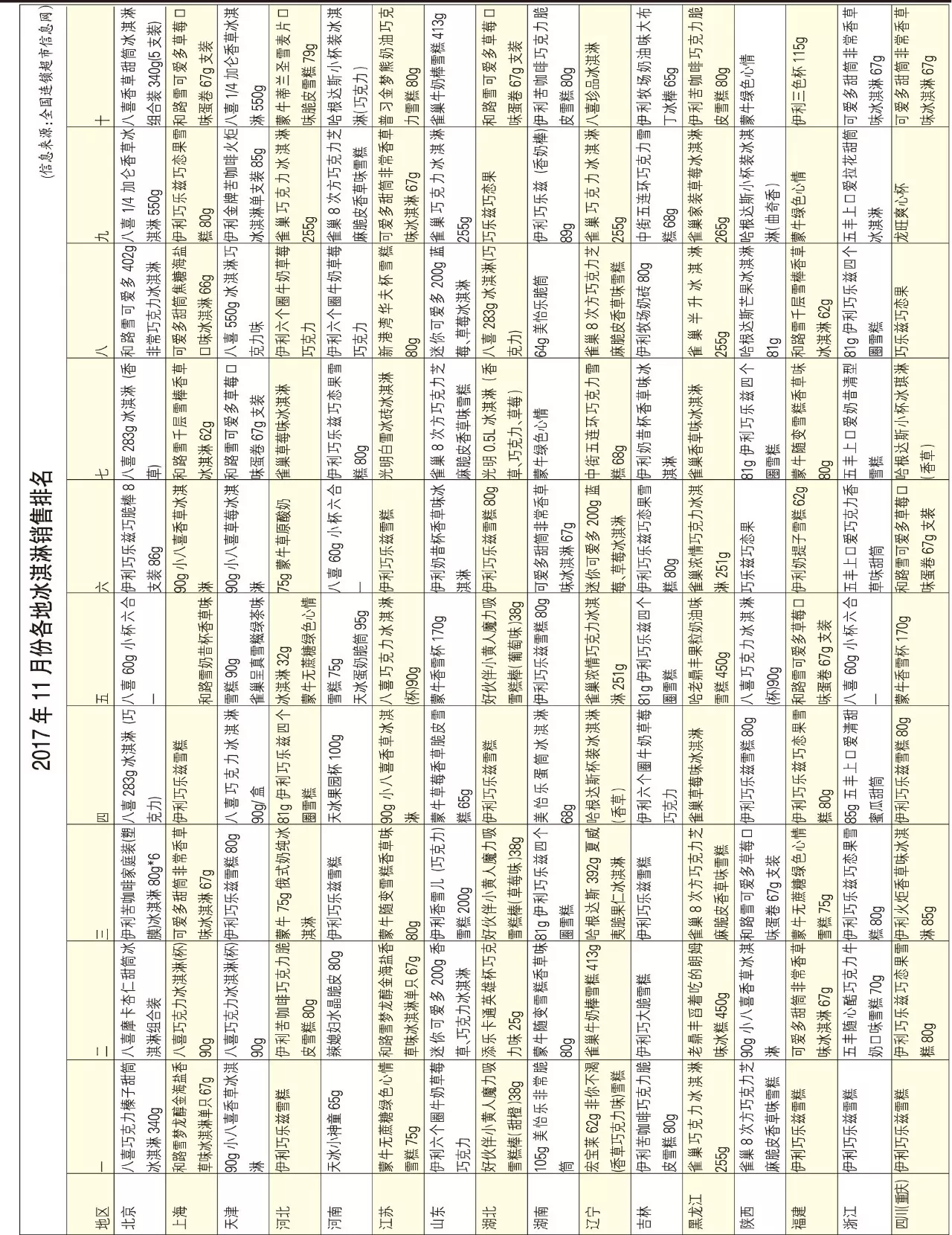 來(lái)源: 冷凍食品網(wǎng) 發(fā)布者:編輯▼2017年11月份各地冰淇淋銷售排名