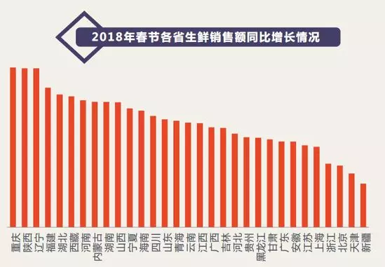 透過京東平臺,來自全球的進口海鮮和進口水果走上了國民的餐桌,彌補了地域的飲食不均衡,與2017年春節(jié)期間相比,2018年春節(jié)生鮮消費同比增長最快的省份包括重慶、陜西、遼寧、福建、湖北,其銷售額同比增長均超過300%。