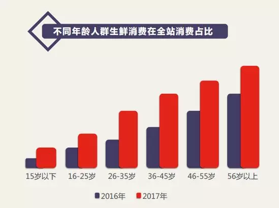 對比不同年齡段用戶在京東平臺的消費結(jié)構(gòu)發(fā)現(xiàn),50后、60后和70后用戶的生鮮消費在其京東全站消費占比最高,可見“銀發(fā)經(jīng)濟”效應(yīng)在生鮮電商領(lǐng)域更為明顯,網(wǎng)上買菜、買肉的習(xí)慣也在逐步取代菜市場在中老年人心里的地位。