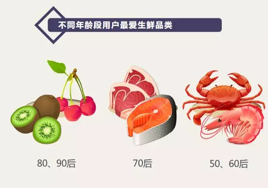 京東大數(shù)據(jù)發(fā)現(xiàn),80后、90后愛買水果,奇異果/獼猴桃、車?yán)遄邮撬麄兊淖類?70后偏愛買豬牛羊雞肉和蛋類;50后和60后愛買海鮮水產(chǎn),其中以魚類和蝦類居多。