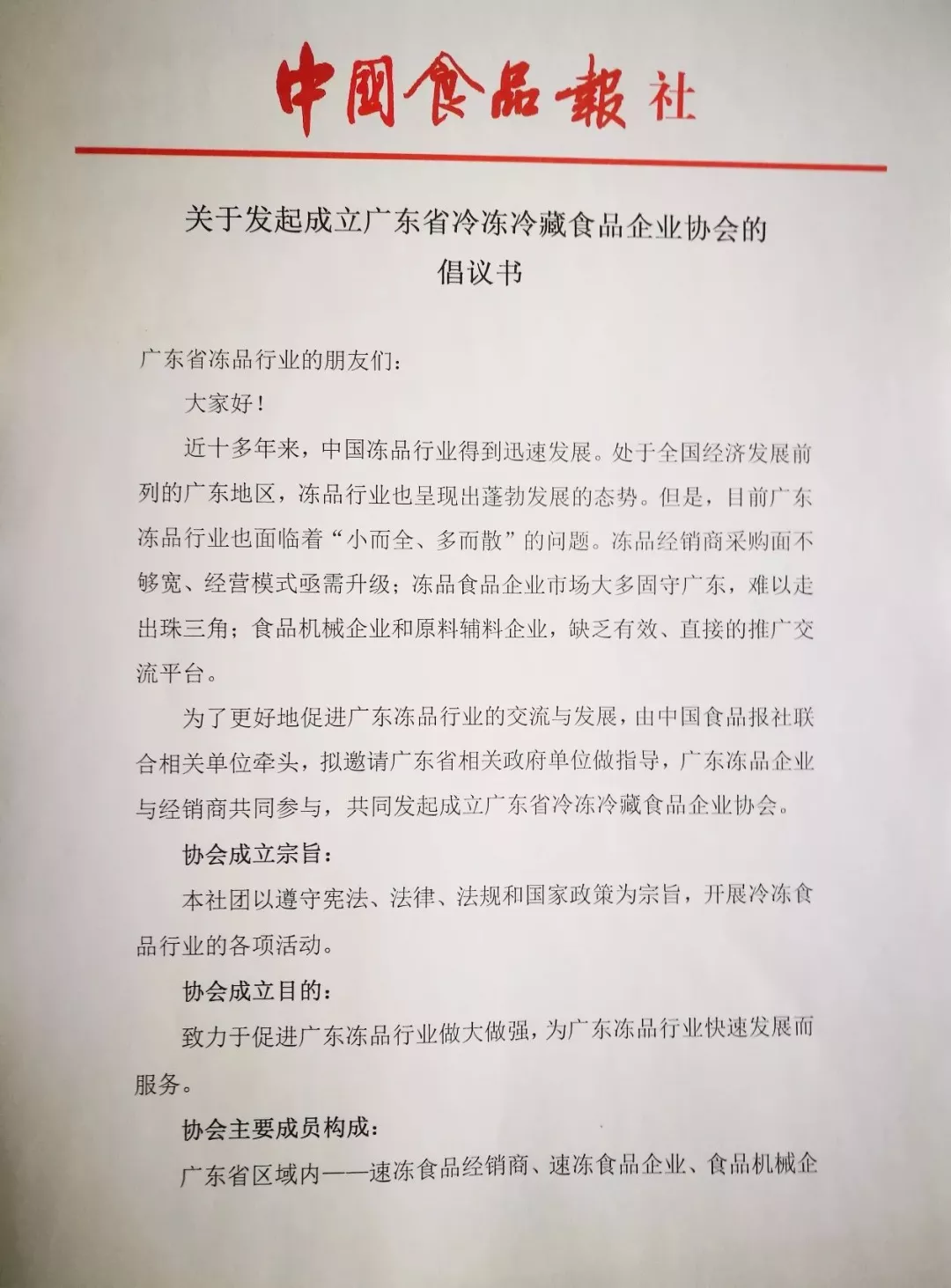 由《中國食品報(bào)》《現(xiàn)代食品》雜志社牽頭,擬邀請廣東省相關(guān)政府單位做指導(dǎo),廣東凍品企業(yè)與經(jīng)銷商共同參與,共同發(fā)起成立廣東省冷凍冷藏食品企業(yè)協(xié)會(huì)。