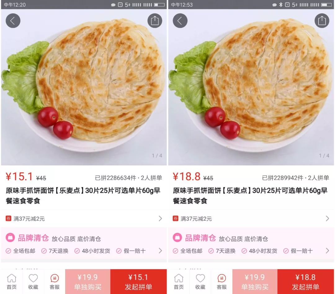 先來(lái)看一張截圖,這是在拼多多上銷(xiāo)售的一款手抓餅,25片一件(桶)的手抓餅,原價(jià)45元,實(shí)際售價(jià)18.8元,有時(shí)會(huì)還會(huì)出現(xiàn)15.1元的促銷(xiāo)價(jià),拼單銷(xiāo)量已經(jīng)超過(guò)了228萬(wàn)件(桶)。
