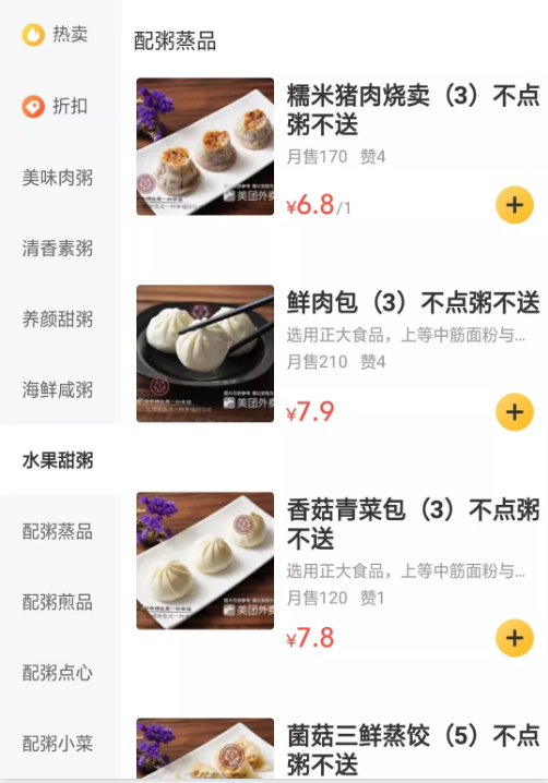 在美團上,簡單翻看幾家粥店,我們就可以發(fā)現(xiàn),眼下火熱的“粥時代”,的確藏了不少關(guān)于速凍食品的商機,很多粥店在賣粥的同時,都會搭配很多諸如燜面、餅、油條、蒸餃、奶黃包、燒麥、包子等食物,名義上是配餐,實際上市場銷量是非??捎^的。