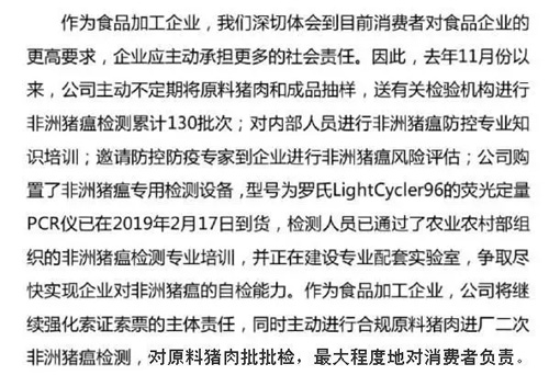 三全食品稱, 公司購置的非洲豬瘟專用檢測設備已于2月17日到貨,檢測人員也已通過了農業(yè)農村部組織的非洲豬瘟檢測專業(yè)培訓,并正在建設專業(yè)配套實驗室,爭取盡快實現(xiàn)企業(yè)對非洲豬瘟的自檢能力。
