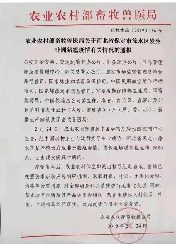 公告顯示,農(nóng)業(yè)農(nóng)村部接到中國(guó)動(dòng)物疫病預(yù)防控制中心報(bào)告,經(jīng)中國(guó)動(dòng)物衛(wèi)生與流行病學(xué)中心確診,保定市徐水區(qū)某養(yǎng)殖場(chǎng)發(fā)生非洲豬瘟疫情。該養(yǎng)殖場(chǎng)現(xiàn)存欄生豬5600頭,已出現(xiàn)發(fā)病死亡病例。