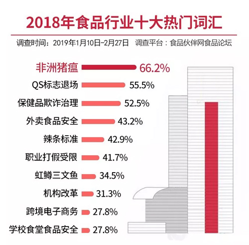 按照以往的慣例,本次活動首先由食品論壇的熱心網(wǎng)友針對2018年熱門事件概括成一個關(guān)鍵詞提交,后經(jīng)過整理篩選出20個候選詞匯,并于2019年1月10日-2月27日在食品論壇投票。期間共有708位經(jīng)過審核認證的注冊網(wǎng)友參與投票,最終選出“非洲豬瘟”、“QS標(biāo)志退場”、“保健品欺詐治理”等十大熱門詞匯。