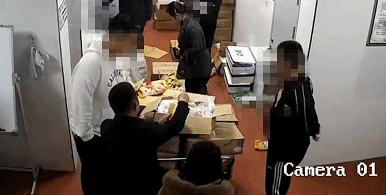 根據(jù)現(xiàn)場監(jiān)控畫面顯示,3月12日22時24分,圖像中央聚集了幾名家長,其中一位穿著黑色夾克的男子從地上撿起一袋姜黃粉( 一種調(diào)味料),撕開,灑向堆放在推車最上方的一箱冷凍雞腿上, 隨后摸出手機(jī)拍照。