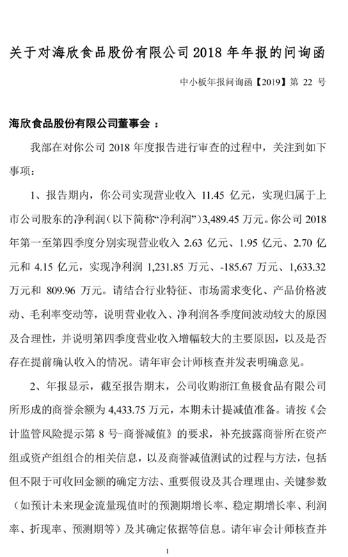 來源: 冷凍食品網(wǎng) 發(fā)布者:編輯3月25日,海欣食品收到年報(bào)問詢函,深交所要求公司結(jié)合行業(yè)特征、市場需求變化、產(chǎn)品價(jià)格波動、毛利率變動等,說明營業(yè)收入、凈利潤各季度間波動較大的原因及合理性,并說明第四季度營業(yè)收入增幅較大的主要原因,以及是否存在提前確認(rèn)收入的情況。