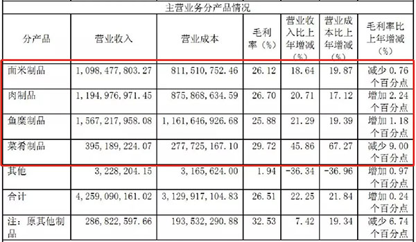 值得注意的是,菜肴制品2018年?duì)I收3.95億元,占總營收的9.28%。雖然這個比重不算太大,但菜肴制品的營收比上年增長45.86%,毛利率更是高達(dá)29.72%,發(fā)展速度非常驚人。