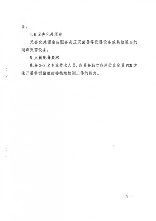 在人員配備方面:要求配備2-3名專業(yè)技術(shù)人員,應(yīng)具備獨(dú)立應(yīng)用熒光定量PCR方法開展非洲豬瘟病毒核酸檢測(cè)工作的能力。