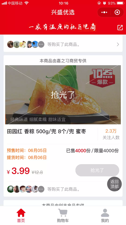 昨天上午,興盛優(yōu)選推出一款500克的田園紅香粽,售價3.99元。10點開賣,僅僅2分鐘就賣出4000份,共1108人參與購買。