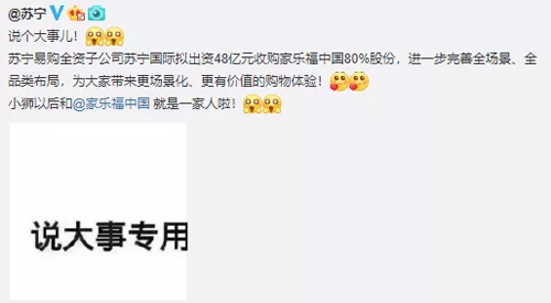 據(jù)悉,這是繼年初收購(gòu)萬達(dá)百貨之后,蘇寧易購(gòu)再次對(duì)線下優(yōu)質(zhì)零售資源發(fā)起進(jìn)攻。本次交易完成后,蘇寧易購(gòu)將成為家樂福中國(guó)控股股東。