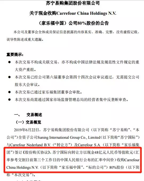 6月23日下午,蘇寧易購(gòu)公告稱,蘇寧易購(gòu)全資子公司蘇寧國(guó)際與家樂福集團(tuán)達(dá)成協(xié)議,擬48億元收購(gòu)家樂福中國(guó)80%股份。