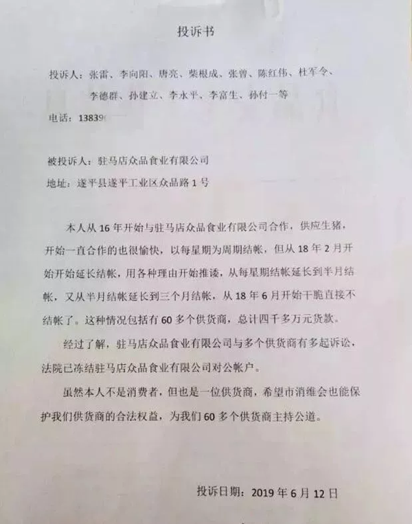 據(jù)張雷了解,僅駐馬店地區(qū)的供貨商被拖欠的貨款就有四五千萬(wàn)。不僅如此,“眾品食業(yè)每個(gè)分廠的生豬欠款都有四五千萬(wàn),七八個(gè)廠區(qū)要好幾個(gè)億,有的供貨商被欠900多萬(wàn)?!睆埨渍f(shuō)。