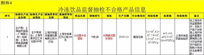 7月15日,國家市場監(jiān)管總局發(fā)布《關(guān)于8批次食品不合格情況的通告》。通告顯示,一批次標(biāo)稱上海光明食品銷售有限公司經(jīng)銷的、上海益民食品一廠有限公司生產(chǎn)的光明牌大白雪牛奶雪糕,菌落總數(shù)超標(biāo)。