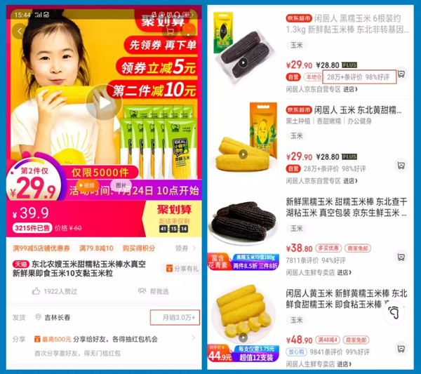 以天貓為例,輸入“糯玉米”搜索,能找到一大批店家,排名第一的“東北農嫂”糯玉米,10支裝月銷3萬+。在京東,一家名為“閑居人”的自營店,主要銷售黑糯玉米,評價就有28萬+。