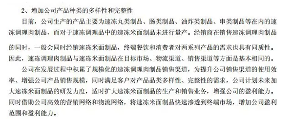 這點可以看看惠發(fā)食品的2018年年報。年報中說,經(jīng)銷商在銷售速凍調(diào)理肉制品的同時,一般會同時經(jīng)銷速凍米面制品。為滿足客戶對產(chǎn)品品類多樣性、完整性的需求,公司計劃未來加大速凍米面制品的研發(fā)力度,適時擴大速凍米面制品的生產(chǎn)和銷售業(yè)務。