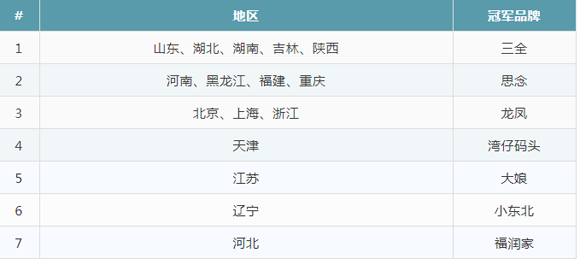 同之前獨(dú)攬8、9個(gè)第一相比,三全本月的業(yè)績(jī)略有下降,僅在5省獲得第一;思念食品緊隨其后,在4個(gè)省獲得第一,業(yè)績(jī)進(jìn)步明顯;龍鳳水餃后勢(shì)勁兒足,一舉拿下3省之冠;往月在北京、上海表現(xiàn)突出的灣仔碼頭,11月僅在天津一地奪冠;有趣的是,河北地區(qū)冒出個(gè)新冠軍——“福潤(rùn)家順福東北風(fēng)味水餃”。