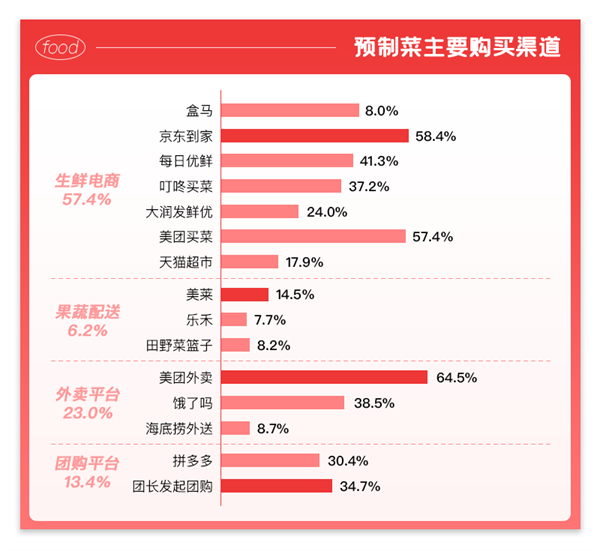 生鮮電商平臺(tái)和外賣平臺(tái)是大家主要購買預(yù)制菜的渠道。