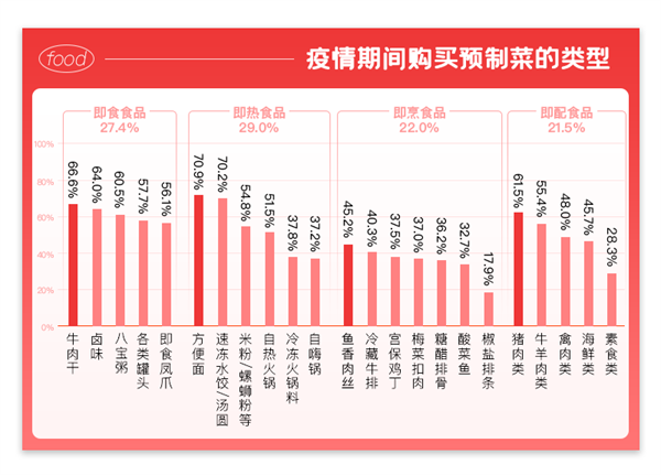 隔離期間以方便面、速凍水餃、牛肉干、八寶粥為代表的即熱食品和即食食品持續(xù)熱銷,這些類型菜品具備“食用方便”和“儲(chǔ)存時(shí)間長”的特點(diǎn),深受消費(fèi)者歡迎;