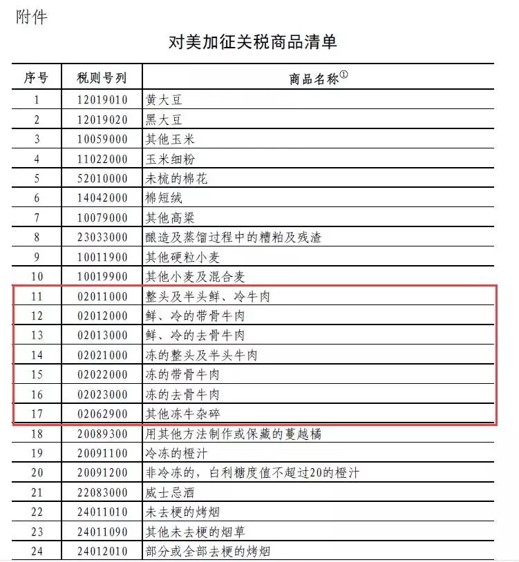 當(dāng)天,根據(jù)《中華人民共和國對外貿(mào)易法》和中華人民共和國進(jìn)出口條例相關(guān)規(guī)定,及經(jīng)國務(wù)院批準(zhǔn),國務(wù)院關(guān)稅稅則委員會決定,對原產(chǎn)于美國的大豆、汽車和牛肉等14類106項(xiàng)商品加征25%關(guān)稅。