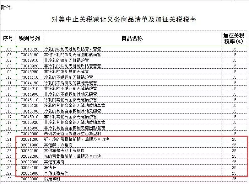 作為回應(yīng),經(jīng)中國國務(wù)院批準(zhǔn),國務(wù)院關(guān)稅稅則委員會決定自2018年4月2日起,對原產(chǎn)于美國的7類128項(xiàng)進(jìn)口商品中止關(guān)稅減讓義務(wù),在現(xiàn)行的適用關(guān)稅稅率基礎(chǔ)上加征關(guān)稅,其中美國豬肉各類產(chǎn)品赫然在列。