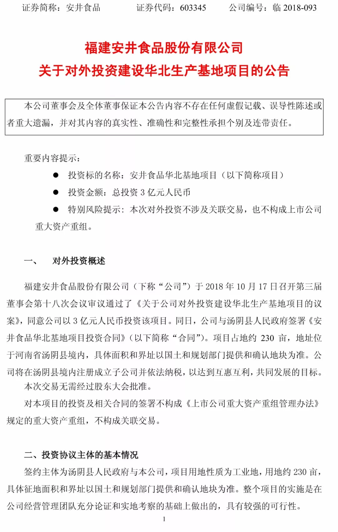 10月17日,安井食品召開第三屆董事會(huì)第十八次會(huì)議,審議通過了《關(guān)于公司對(duì)外投資建設(shè)華北生產(chǎn)基地項(xiàng)目的議案》,同意公司以3億元人民幣投資該項(xiàng)目。同日,公司與湯陰縣人民政府簽署《安井食品華北基地項(xiàng)目投資合同》。