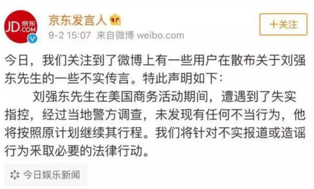 北京時(shí)間 9 月 2 日下午 3 點(diǎn) 07 分,京東發(fā)言人在微博上發(fā)聲明稱網(wǎng)上為 " 不實(shí)傳言 ",并表示 " 劉強(qiáng)東在美國(guó)商務(wù)活動(dòng)期間,遭遇到了失實(shí)指控,經(jīng)過(guò)當(dāng)?shù)鼐秸{(diào)查,未發(fā)現(xiàn)有任何不當(dāng)行為,他將按照原計(jì)劃繼續(xù)其行程。我們將針對(duì)不實(shí)報(bào)道或造謠行為釆取必要的法律行動(dòng)。"