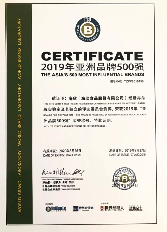 海欣食品蟬聯(lián)《亞洲品牌500強(qiáng)》